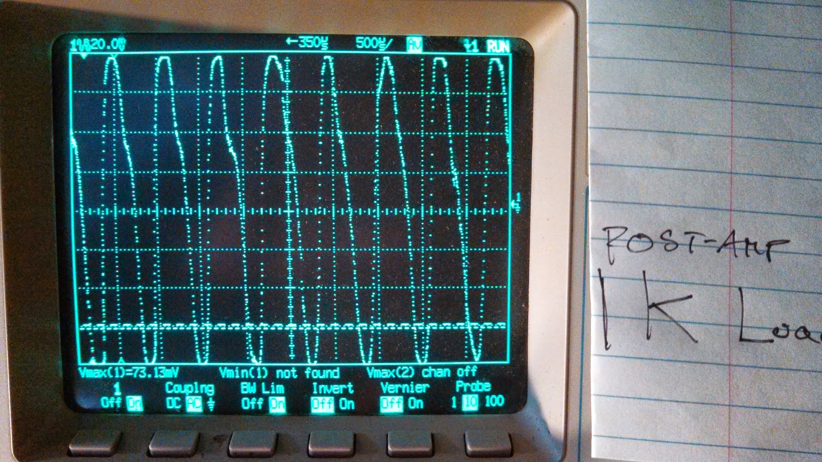Here is an example of the amplification of a small audio signal. The first image is the audio source driving a 1k load, and the second is the amplifier driving a 1k load while fed by the same source.